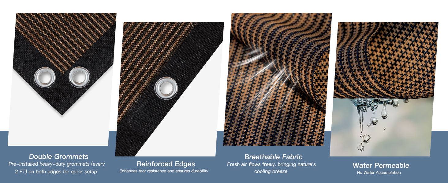 Made from premium 200 GSM HDPE material, this fabric blocks 90% of UV rays, offering excellent sun protection. Its breathable design ensures airflow, keeping you cool. It also provides privacy without obstructing your view.