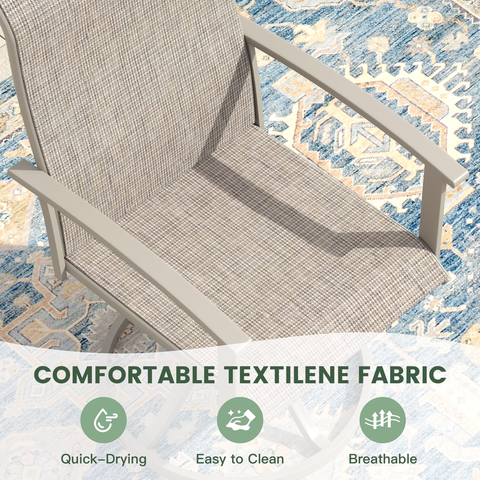 - 【Patio Swivel Chairs】 Durable easy-care and quick-drying fabric effortlessly blend in with any style of outdoor decor, fade and stain-resistant.