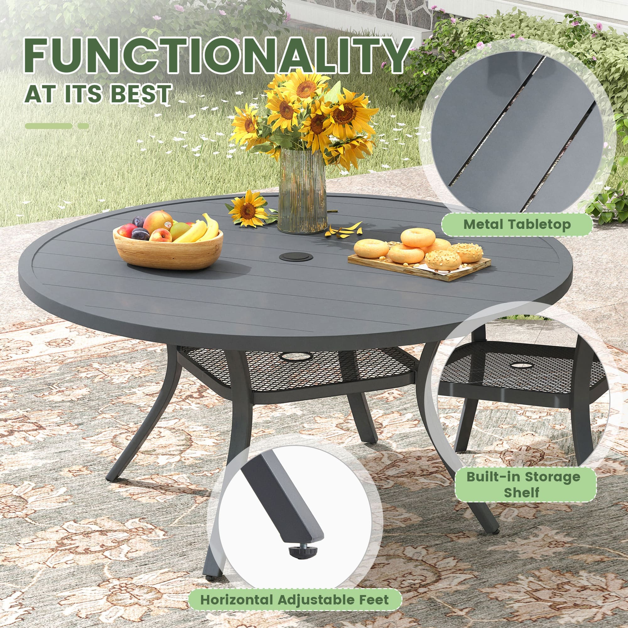 - 【Umbrella Hole】: The patio round table features an adjustable umbrella hole (1.57" - 1.9", with hole cover included) to accommodate an umbrella for sun protection.