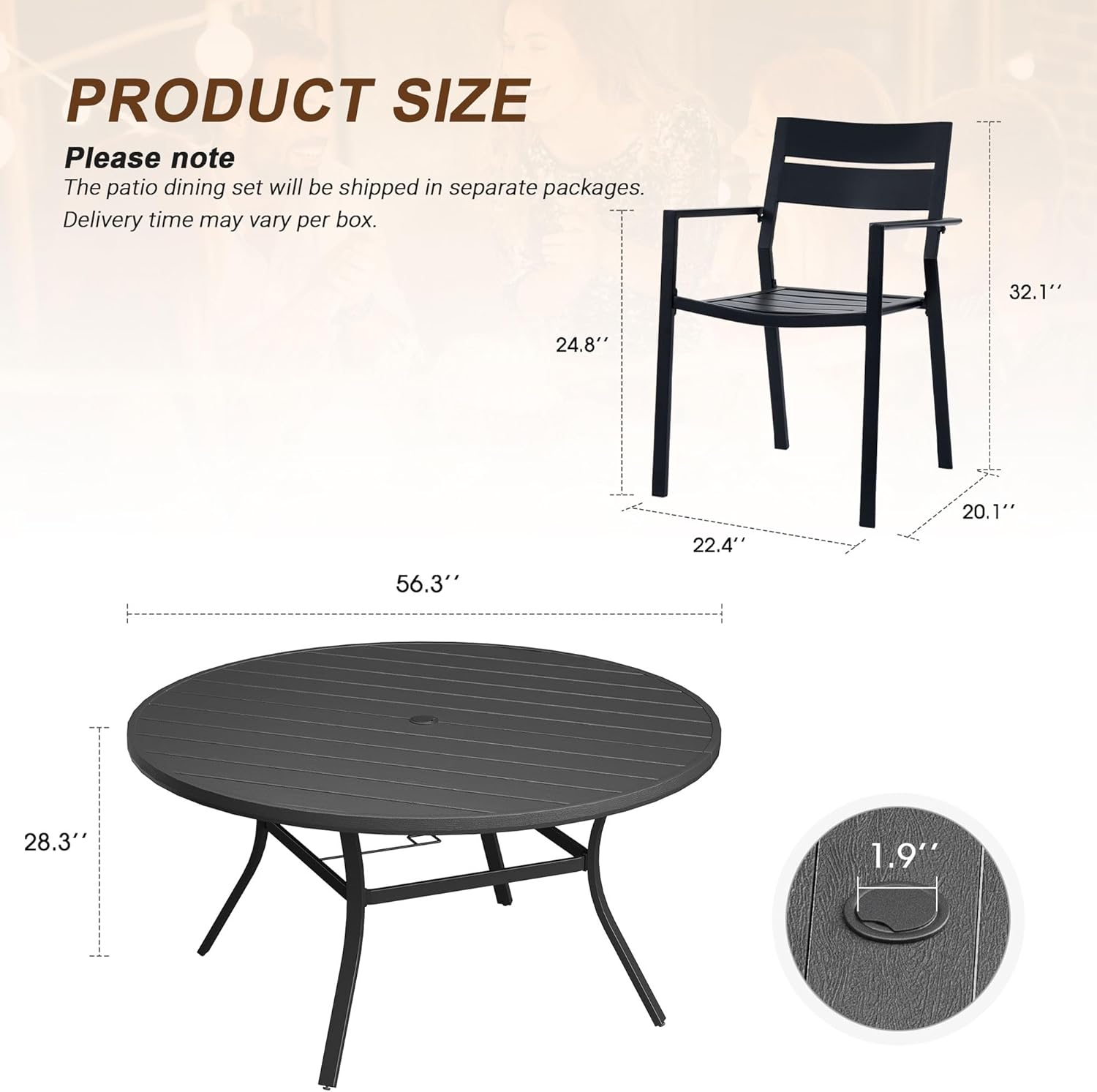 • Product Dimension:Table: 56.3"L x 56.3"W x 28"H. Perfect for gatherings of 8 people. Chair: 22.4"L x 20.1"W x 32.1"H. Adjustable Umbrella Hole Diameter: 1.57"-1.9". Installation tip: Don't tighten all screws or bolts until all the pieces are completely assembled.