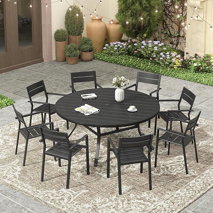 Vicllax Patio Outdoor Dining Table Set of 8, Plastic Round Table 56.3" with Stackable Dining Chairs