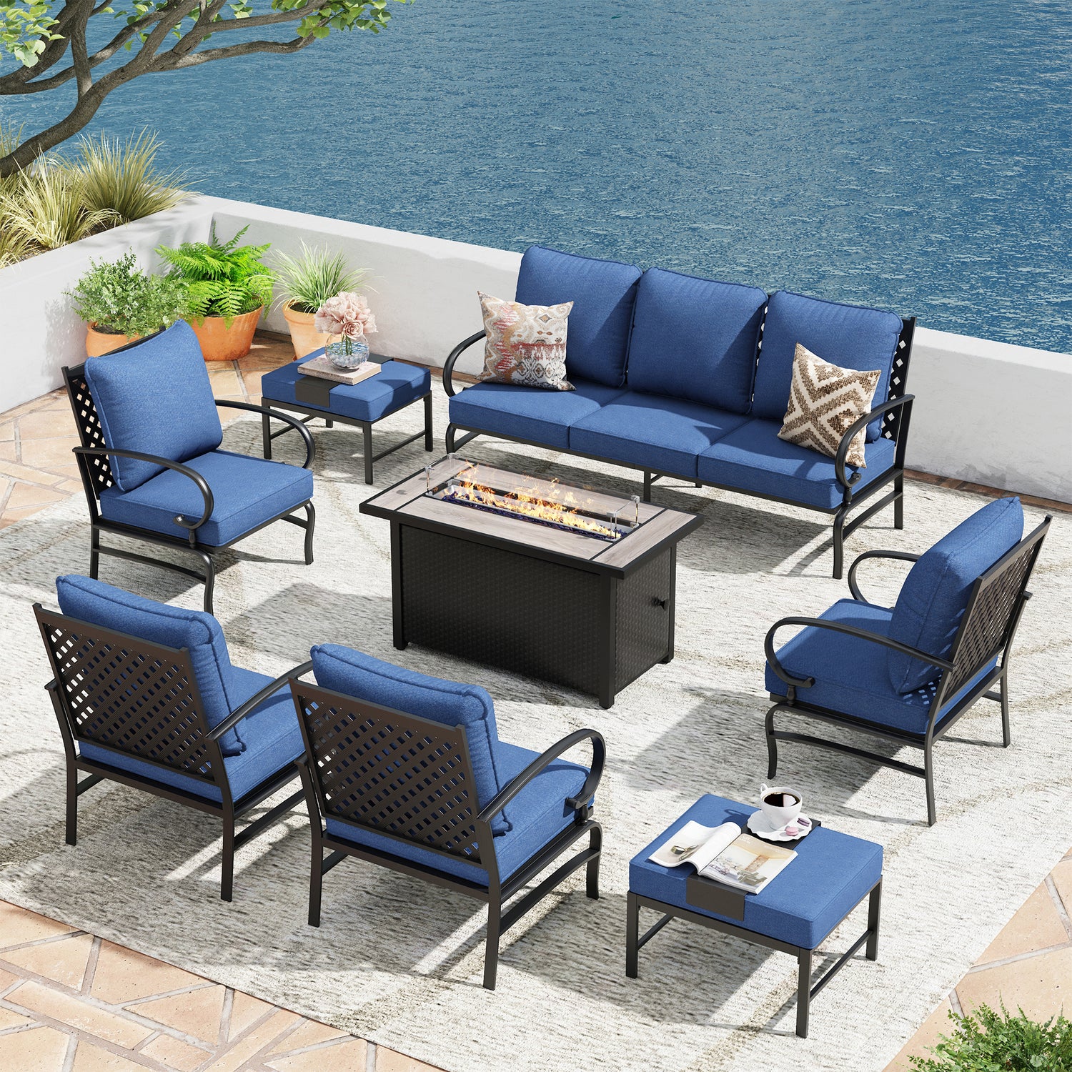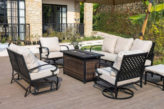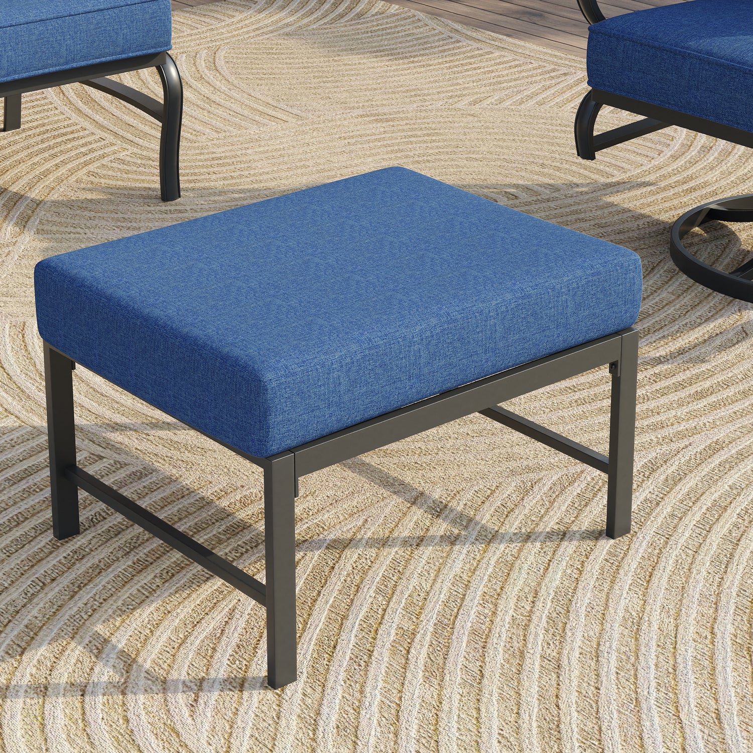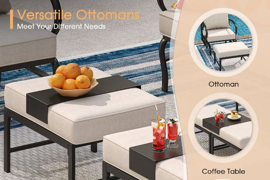 The set includes two ottomans that serve as tables or footrests, adding practicality and comfort to your outdoor lounging. Whether for holding items or resting your feet, they enhance your patio furniture's functionality.