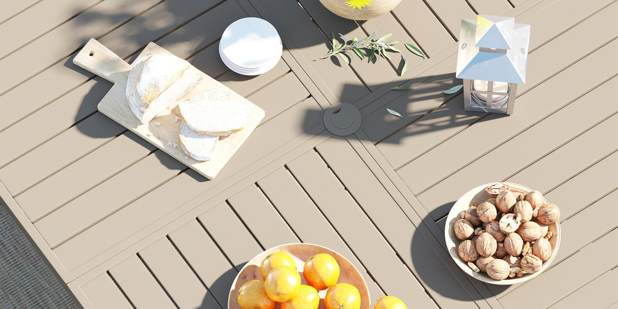 Simple and stylish slatted tabletop design, with a special powder coating treatment, the large dining table has good applicability and weather resistance.