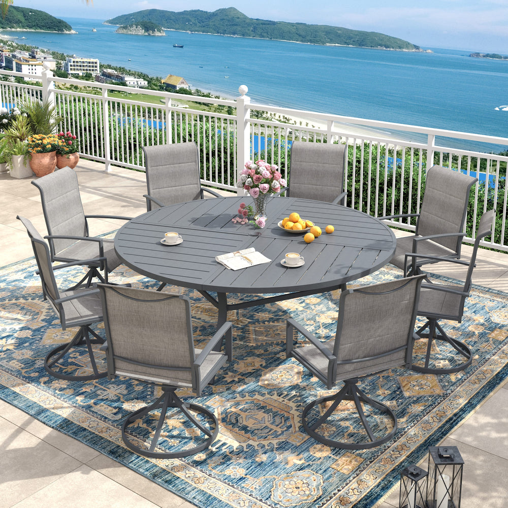 VICLLAX 9 PCS Patio Dining Table Set, 63" Round Metal Table with umbrella Hole and 8 Padded Swivel Chairs