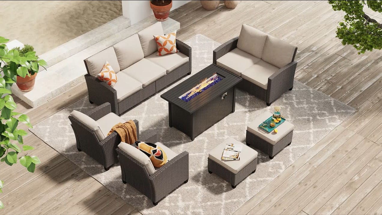- 【Spacious Seating Space】The VICLLAX conversation set includes a 3-seat sofa, fire pit, single sofa chair, lover sofa and ottoman, catering to your family gatherings. High backrest is designed to offer exceptional support and comfort for your back. The stylish and modern shape complements your backyard, poolside or garden.