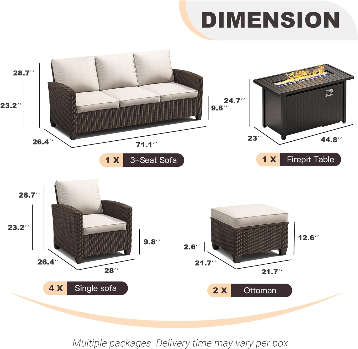 - 【Spacious Seating Space】The VICLLAX conversation set includes a 3-seat sofa, fire pit, single sofa chair, lover sofa and ottoman, catering to your family gatherings. High backrest is designed to offer exceptional support and comfort for your back. The stylish and modern shape complements your backyard, poolside or garden.