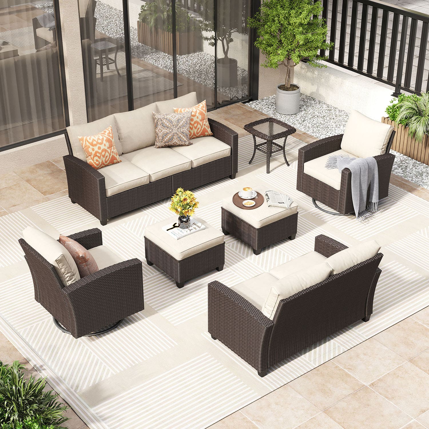 Vicllax Patio Sofa Set, Wicker Outdoor Conversation Set with Cushioned Sofa Chairs and Ottomans - Beige / 3 Seater + Stable Chair*2 + Swivel Chair*2 + Ottoman*2 + Side table *1 está agotado y se enviará tan pronto como vuelva a estar disponible.