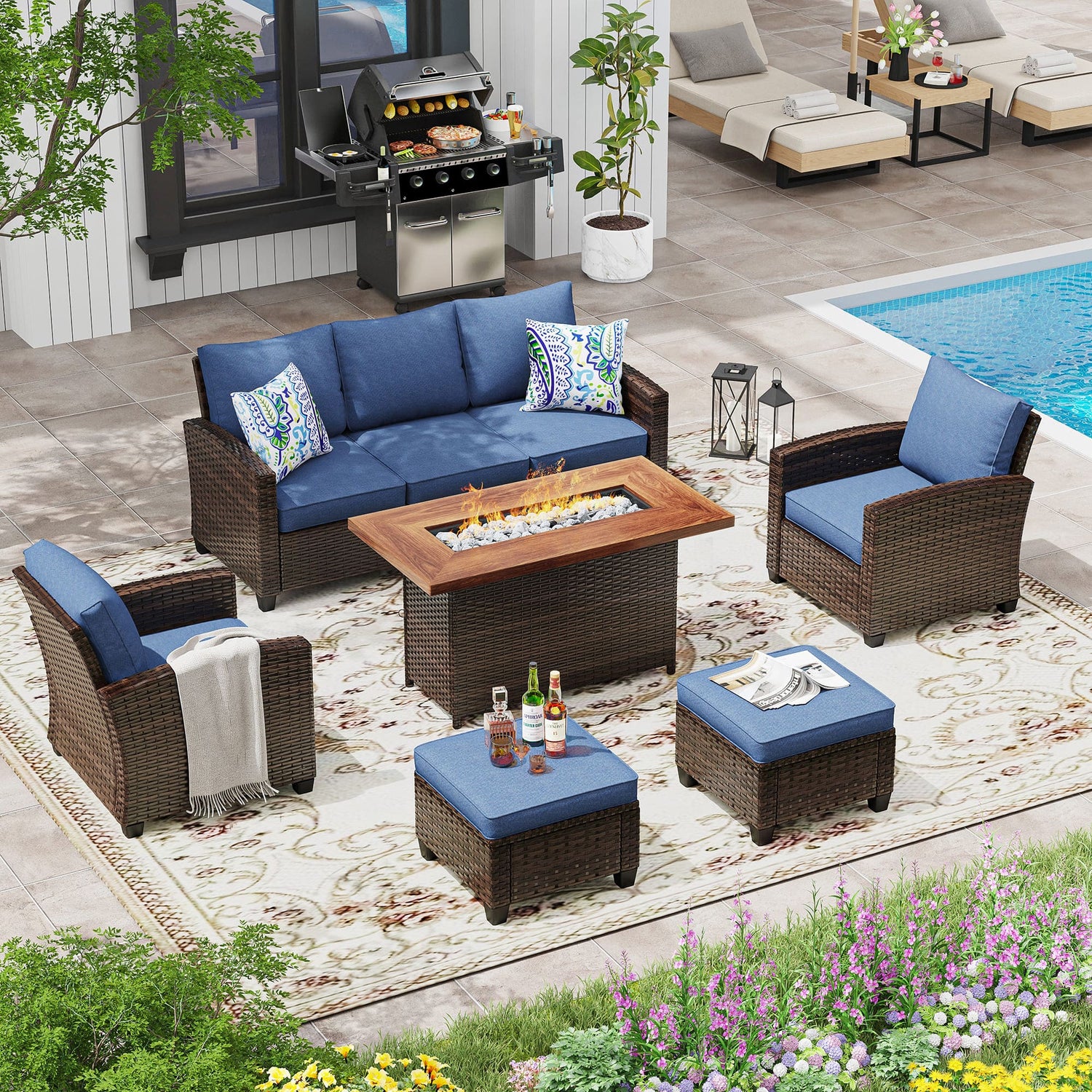Vicllax Versatile Wicker Patio Set: 6 Pieces with Fire Table and Ottoman