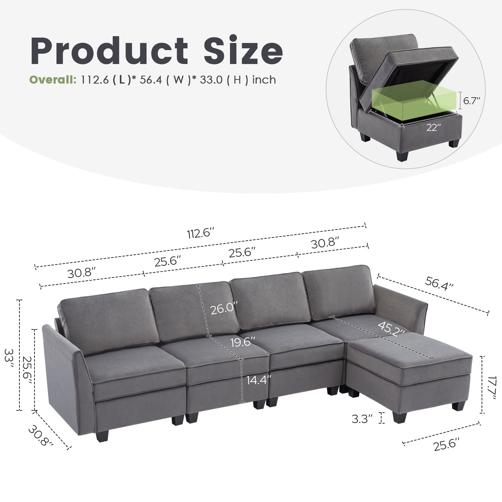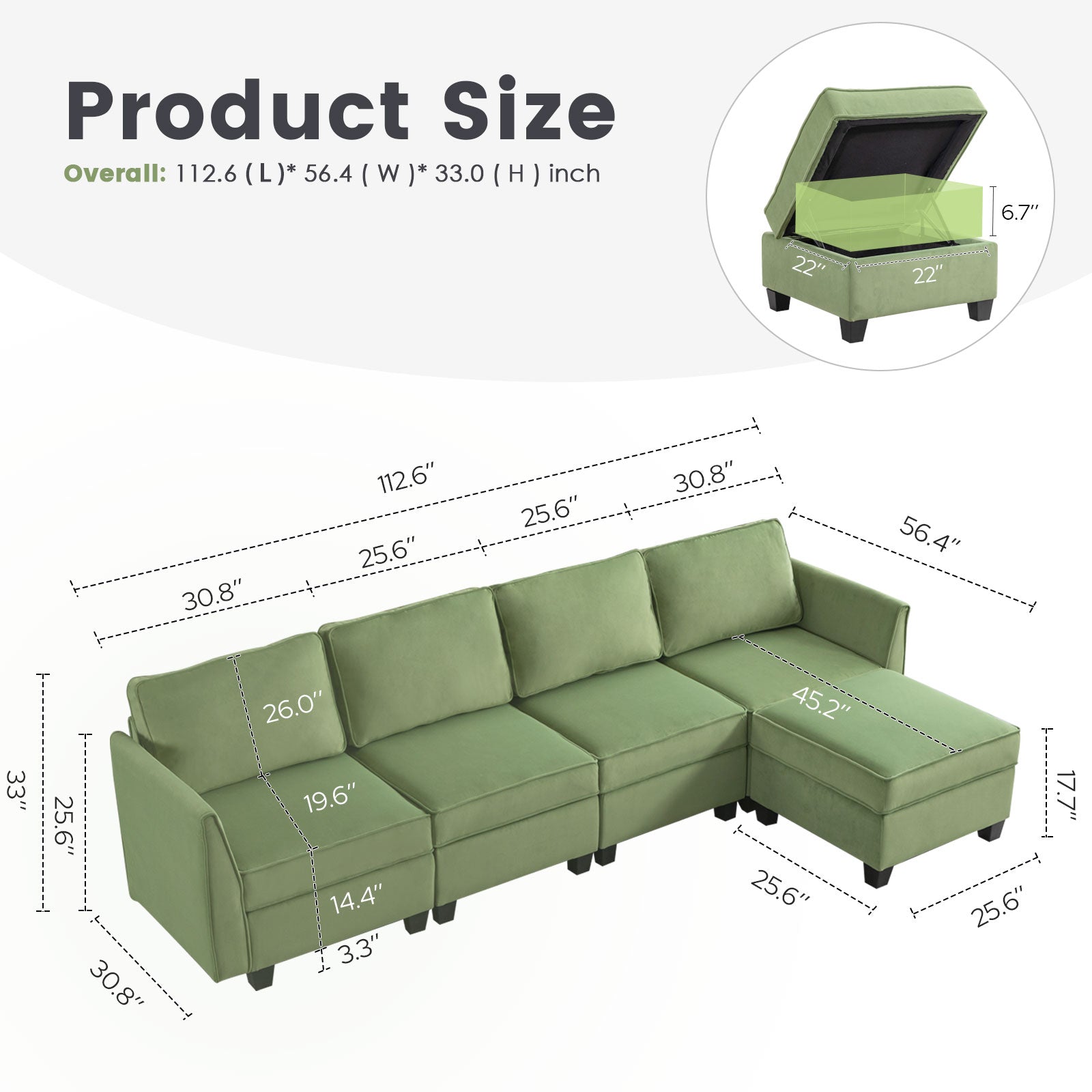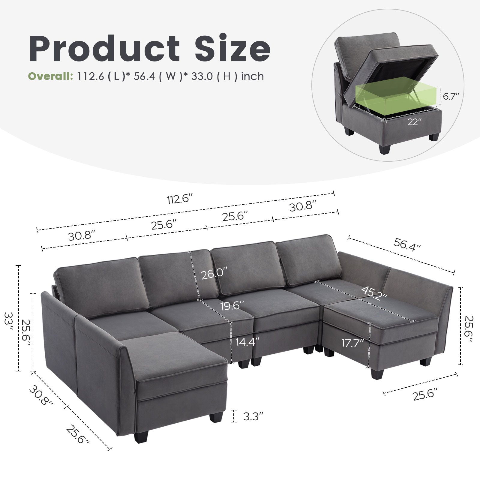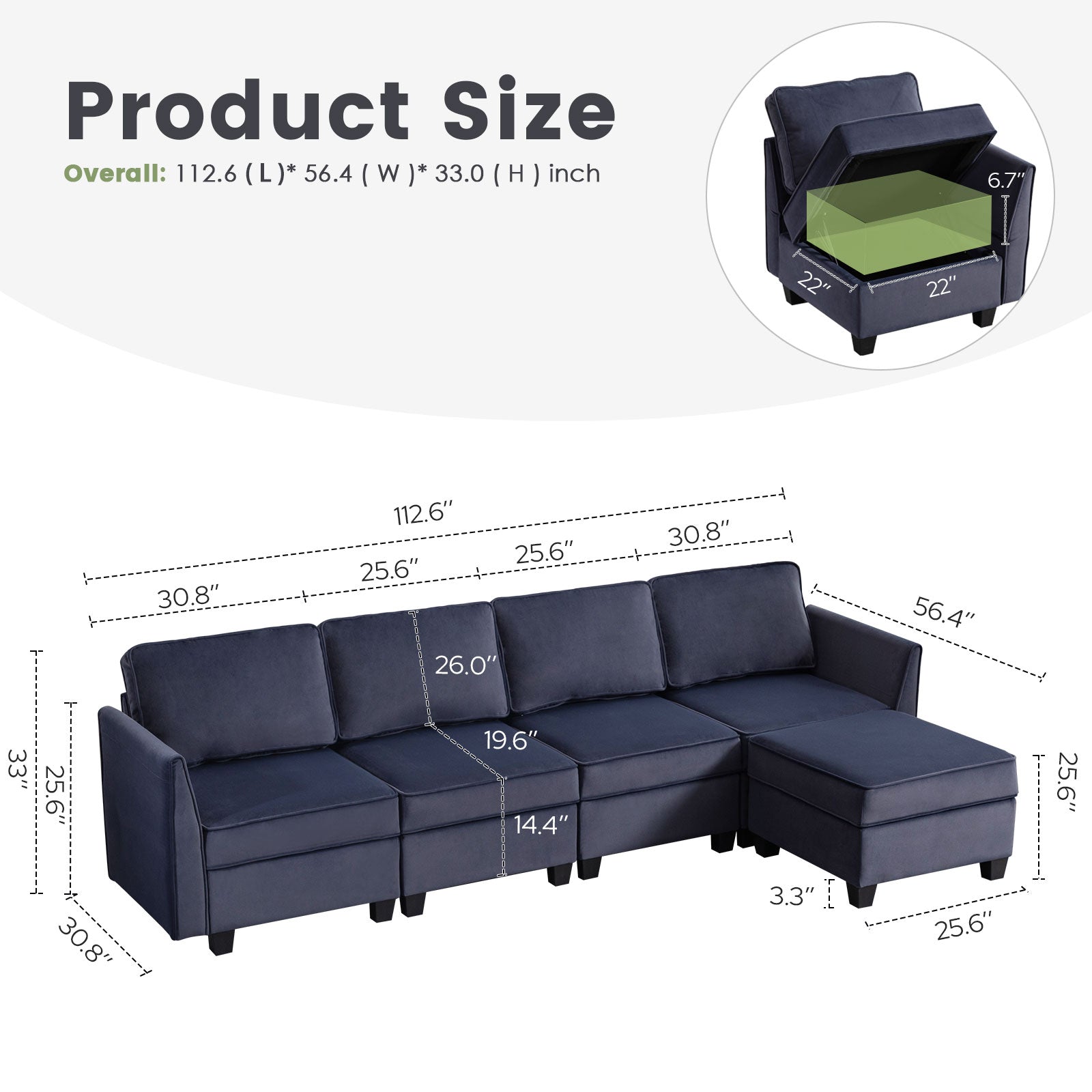 Sofá seccional modular de terciopelo Caleb con almacenamiento y chaise