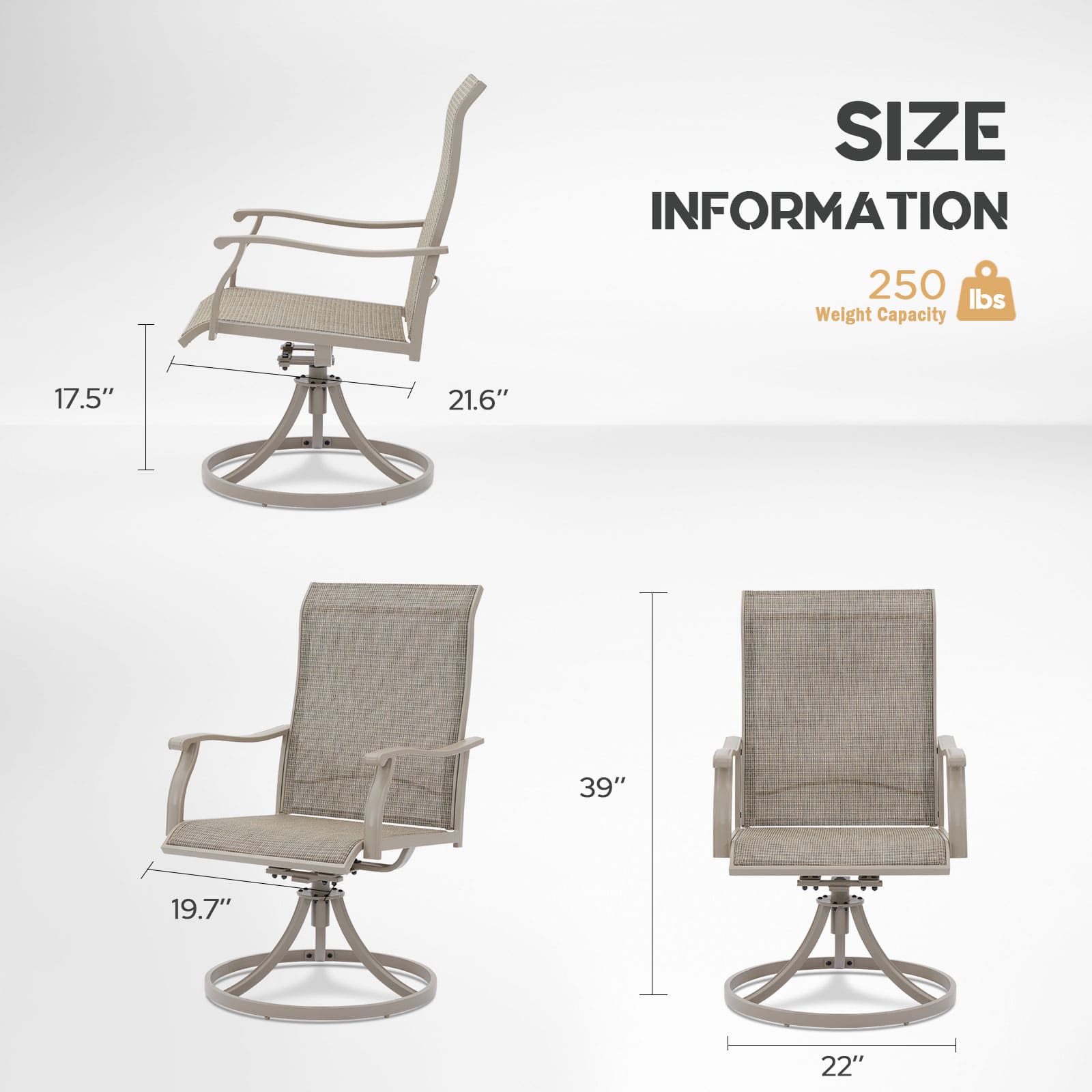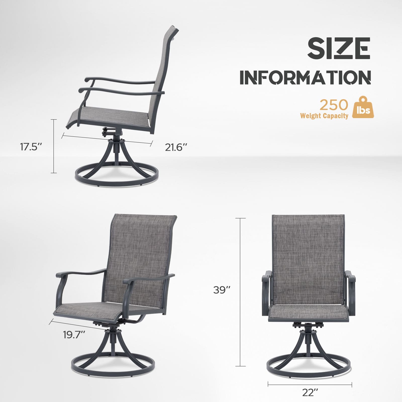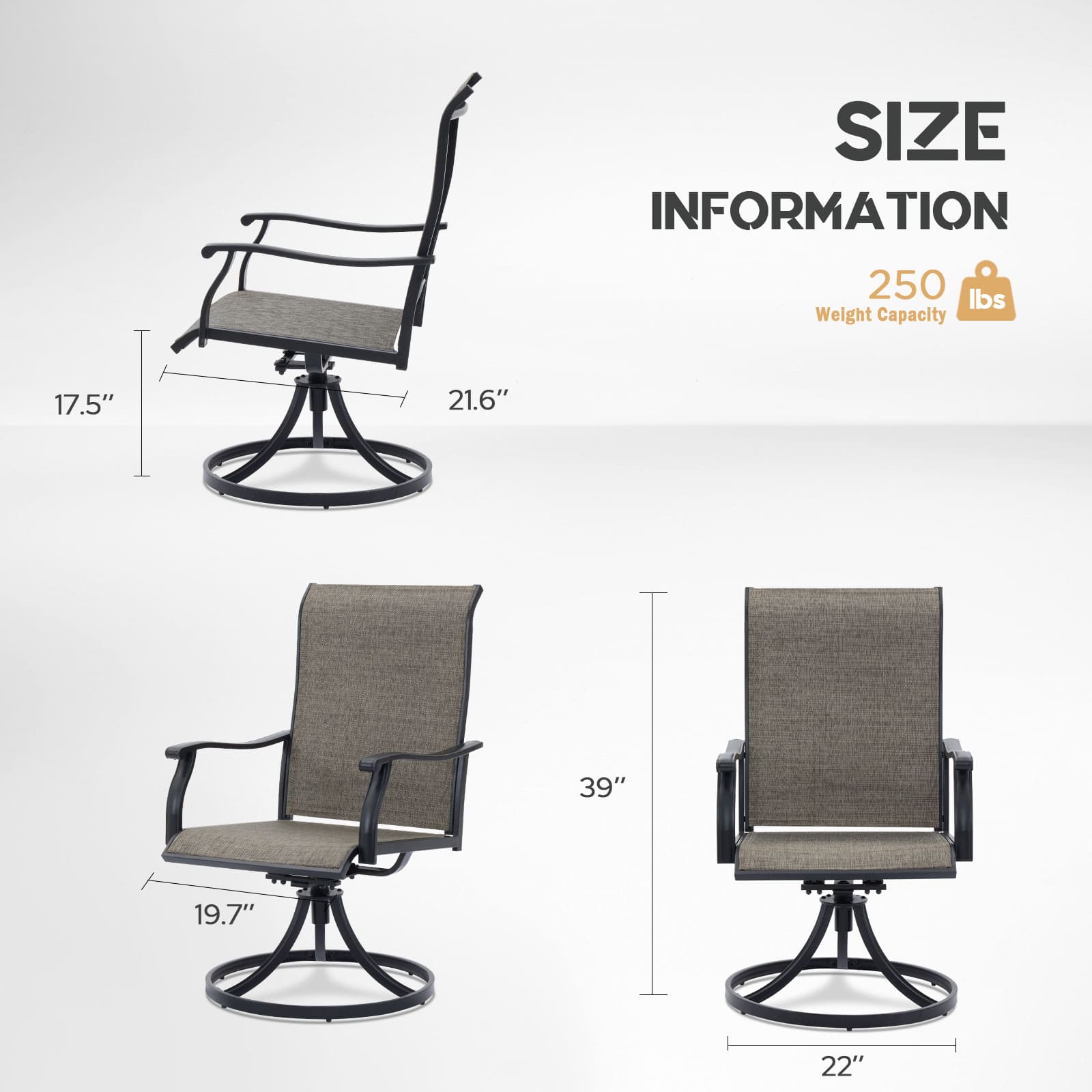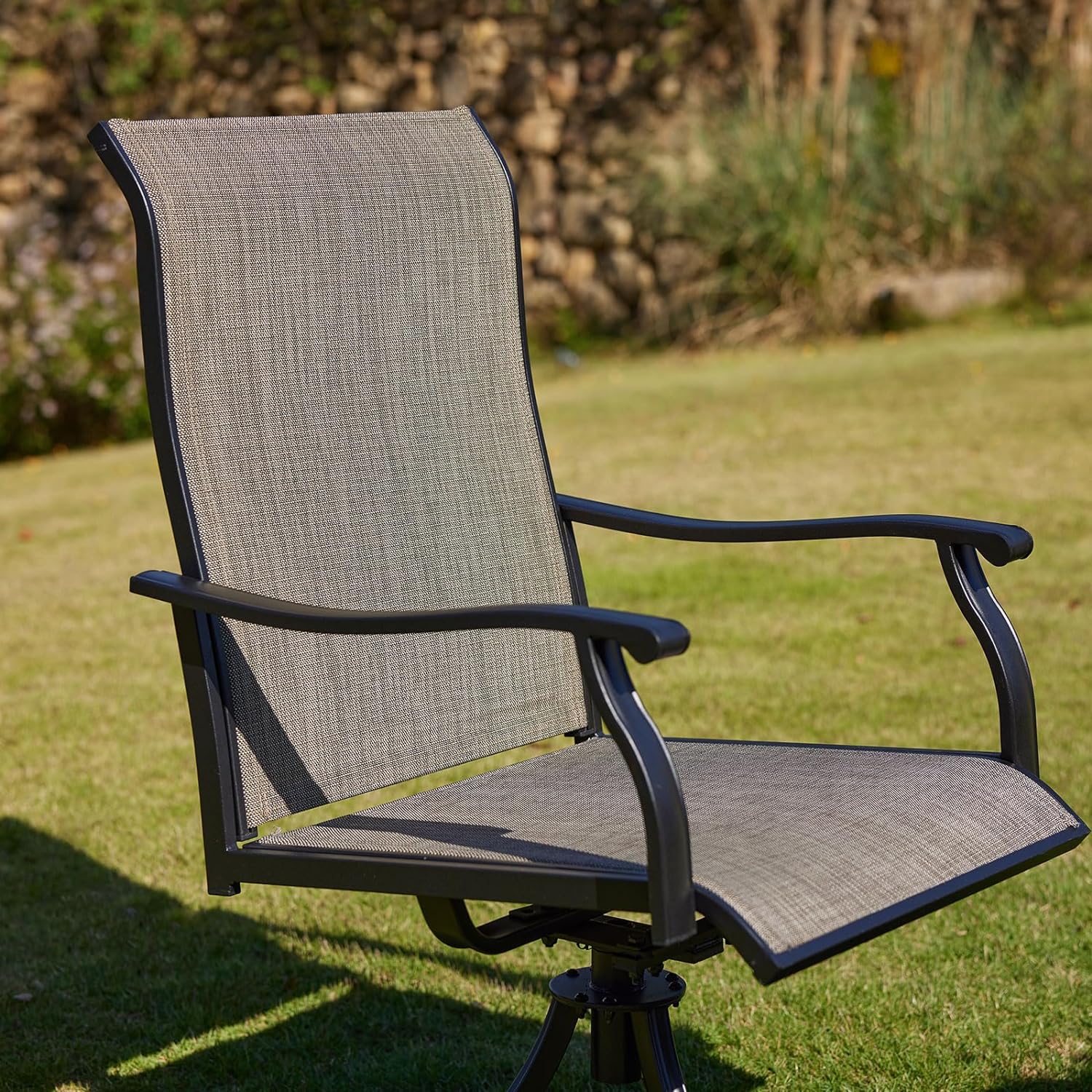 A diferencia de las sillas giratorias normales, esta silla giratoria para exteriores no sólo ofrece un asiento espacioso; también cuenta con un giro silencioso y fluido y un suave movimiento de balanceo que lo hará sentir relajado y cómodo en poco tiempo. Con su diseño elegante, su cómodo arco y su respaldo alto, sentarse en nuestra silla es una experiencia encantadora que no querrá perderse.