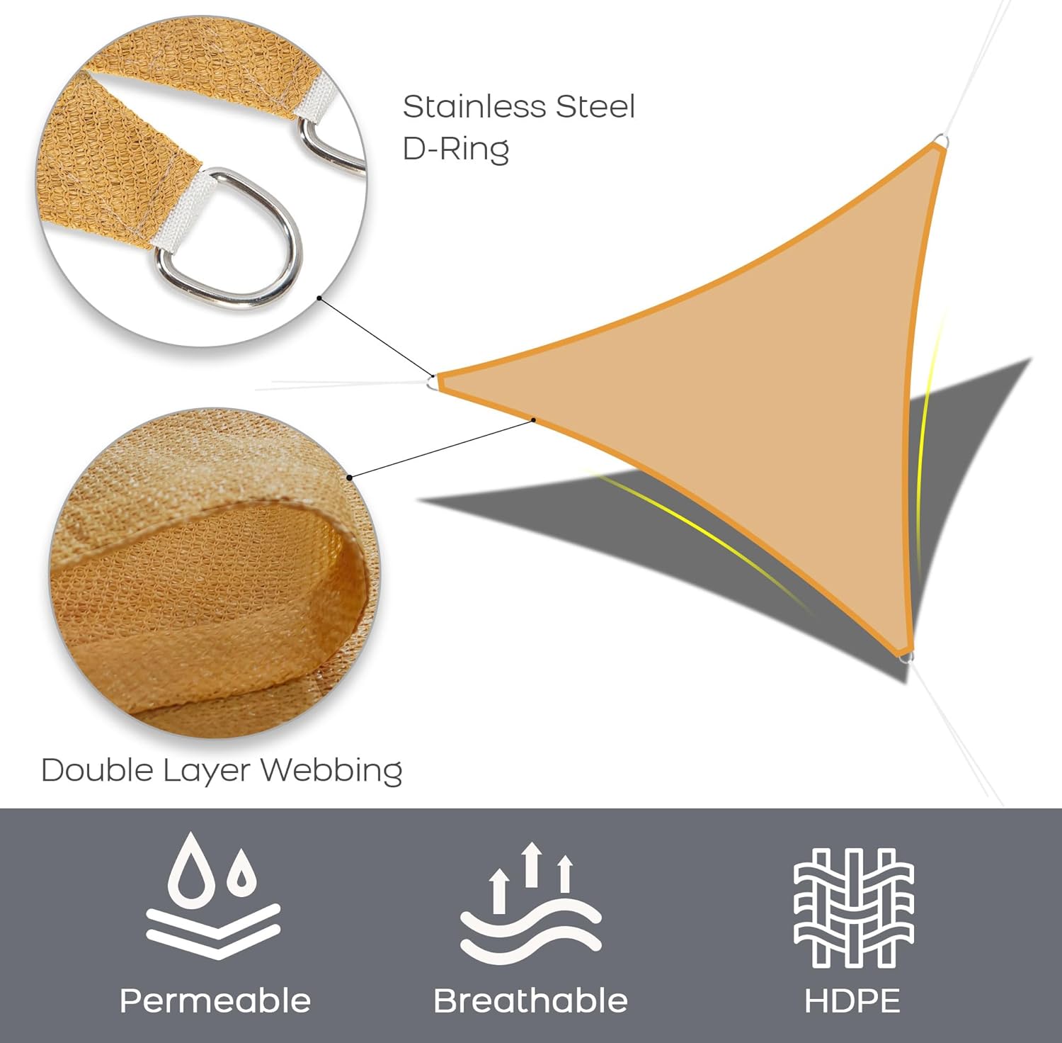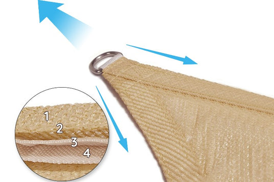 • Reinforced Double Webbing: Our shade sails feature double webbing between the D-ring and sail, providing added stability and strength.