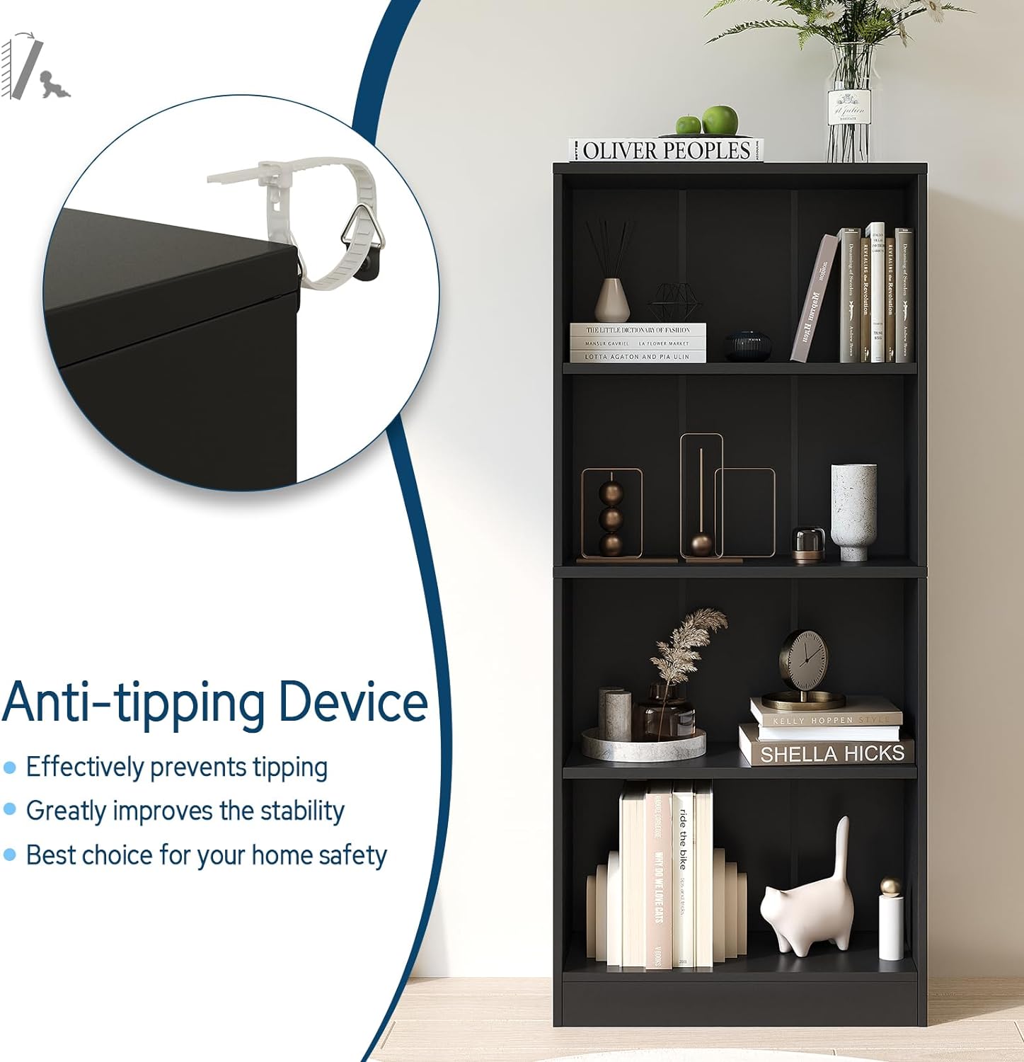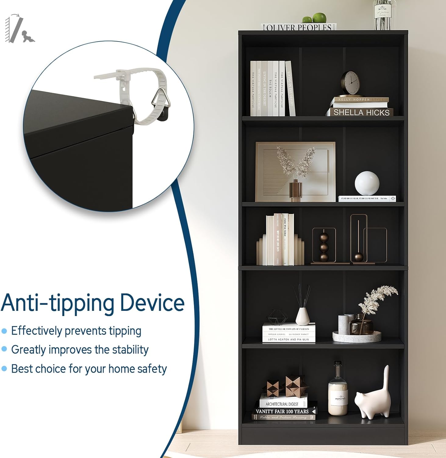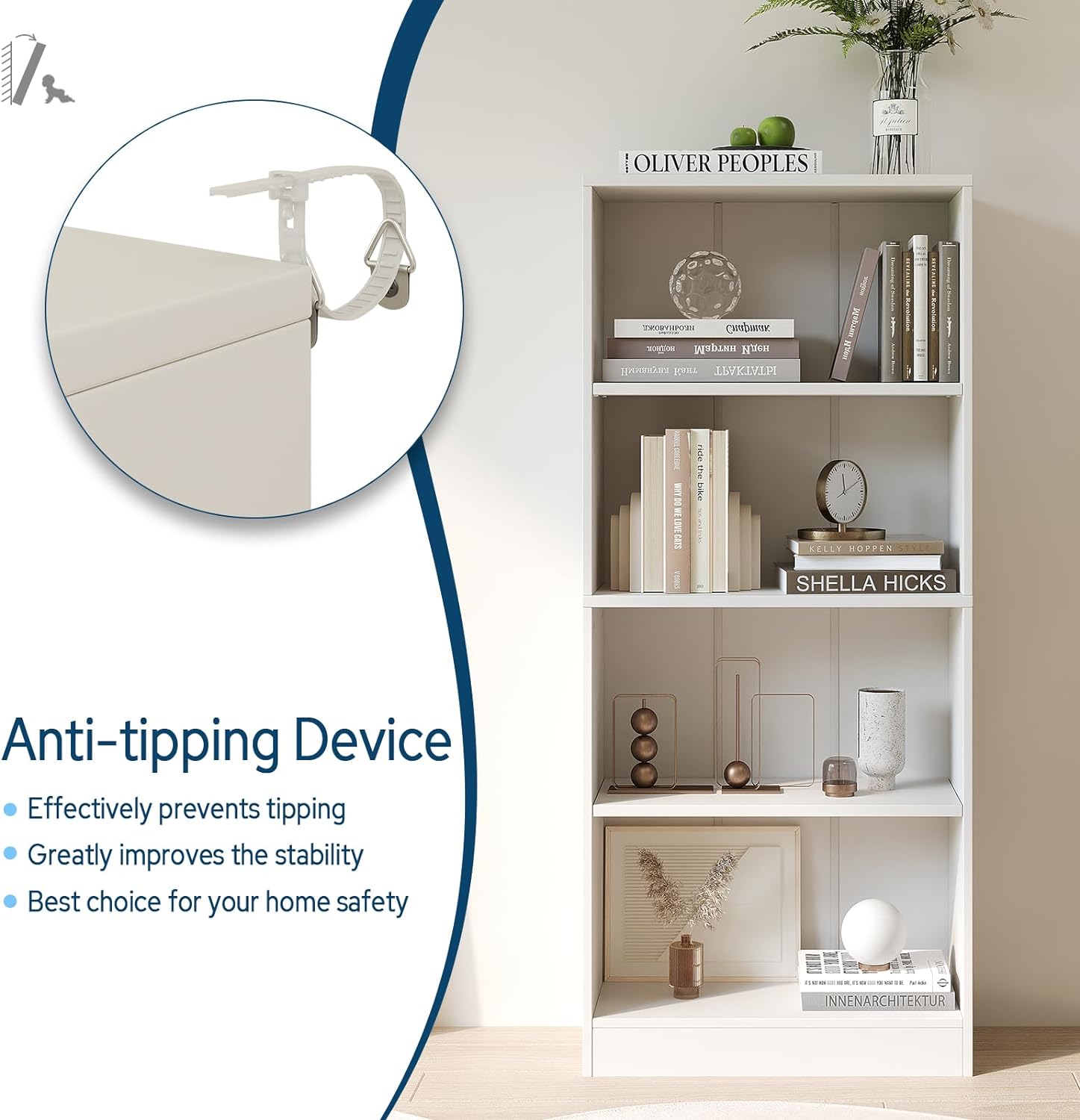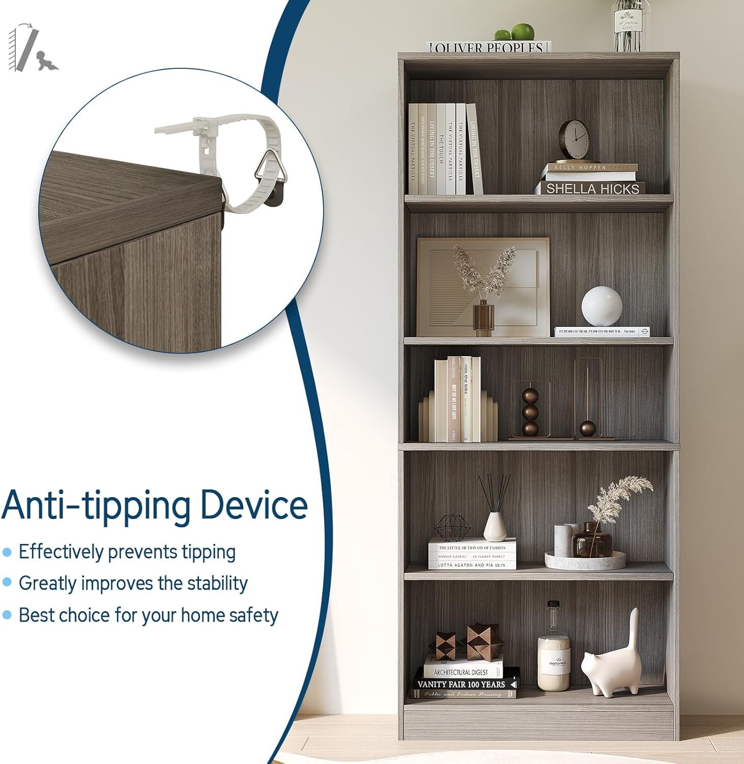 - 【Humanized Design】Equipped with anti-tipping accessories, preventing bookcase from falling down and ensuring home safety. Round Sticker of the same color are provided to cover screw holes, giving the bookcase a harmonious appearance