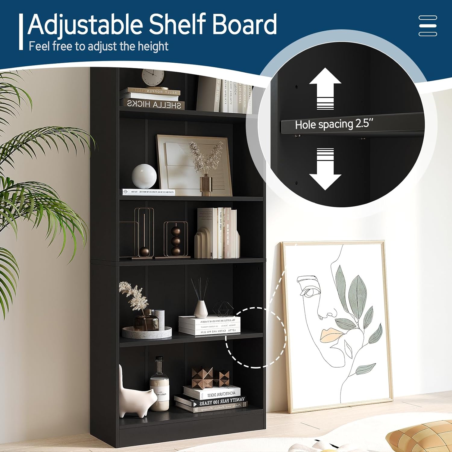 - 【Adjustable Book Shelf】4 open storage spaces with 1 fixed and 2 adjustable solid shelves for various sized decors
